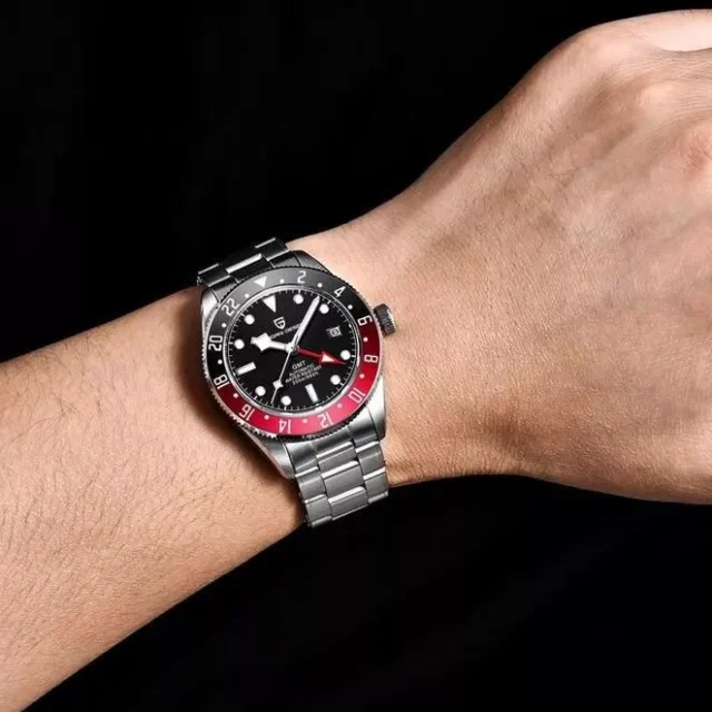 This watch is more than a timepiece; it’s an experience. Whether you’re crossing continents or conquering daily tasks, its functionality ensures you’re on time, every time. The striking burgundy and blue outer ring sets it apart, adding a touch of sophistication to your wrist.