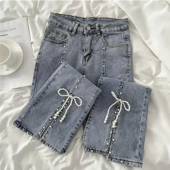 Our jeans aren’t just about looking good — they’re about feeling fantastic, too. The elastic high waist cinches at just the right spot, creating a flattering silhouette that celebrates your curves. The stretch factor? Non-existent, because we believe in keeping things comfortably secure. The playful bow and pearl detailing add a unique touch that sets these trousers apart from your regular denim, making them a special piece in your collection.